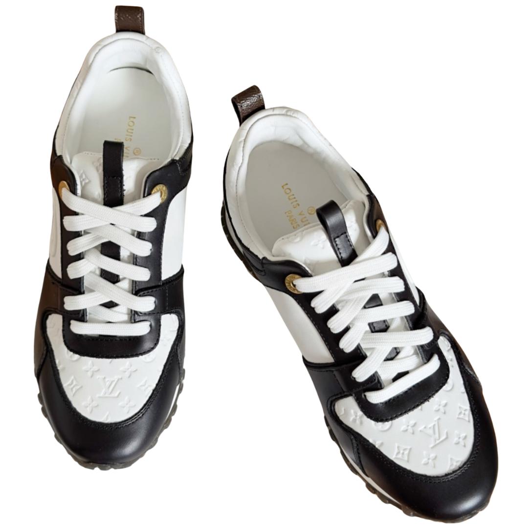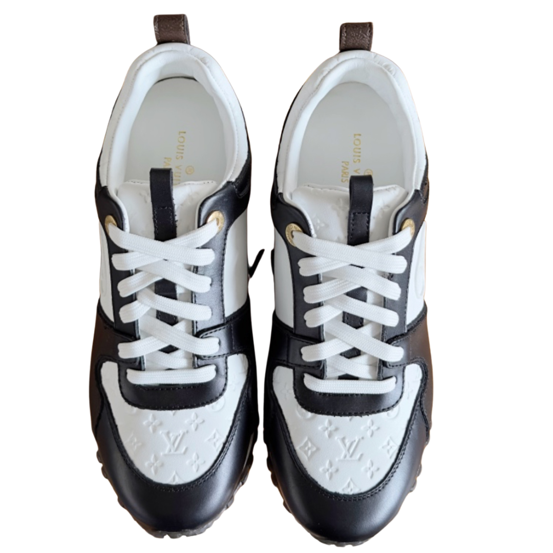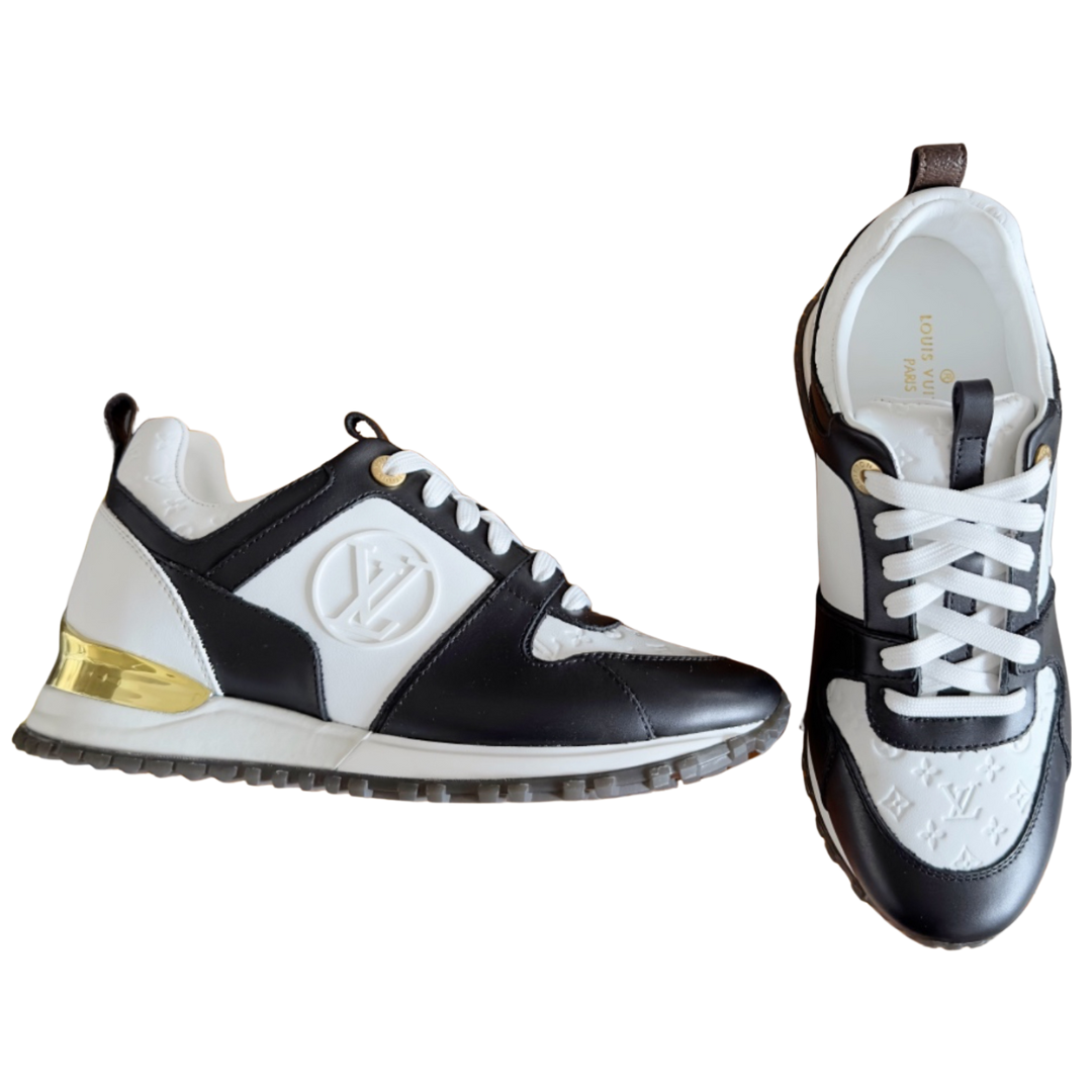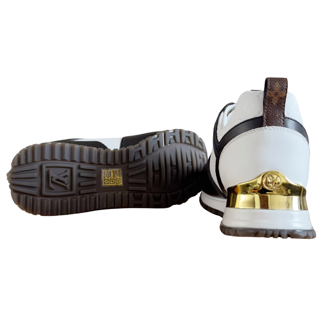 Casuales Run Away de la serie clásica de LV Donkey Brand L. Esta zapatilla Run Away está hecha de cuero de vaca con ribetes de lona Monogram clásicos y está decorada con un gran logotipo de LV Circle en un lado.